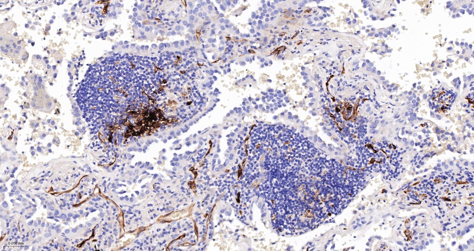 Paraformaldehyde-fixed, paraffin embedded Human Tonsil; Antigen retrieval by boiling in sodium citrate buffer (pH6.0) for 15 min; The section was incubated with FSCN1 Monoclonal Antibody, Unconjugated (bsm-61626R) at 1:200 overnight at 4°C, followed by conjugation to the bs-0295G-HRP and DAB (C-0010) staining.