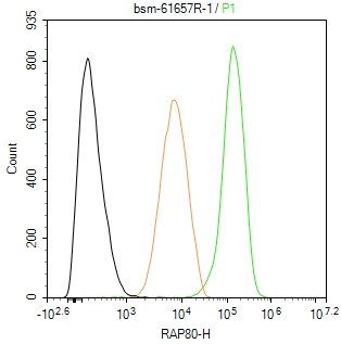 The MCF-7 (H) cells were fixed with 4% PFA (10 min at r.t.) and then permeabilized with 90% ice-cold methanol for 20 min at -20℃,the cells then were incubated in 5%BSA to block non-specific protein-protein interactions (30 min at r.t.), followed by secondary antibody incubation for 40 min at room temperature. Primary Antibody (green):Rabbit Anti-RAP80 antibody (bsm-61657R,1:100); Isotype Control (orange): Rabbit IgG (bs-0295P). Blank control (black): PBS. Acquisition of 20,000 events was performed.