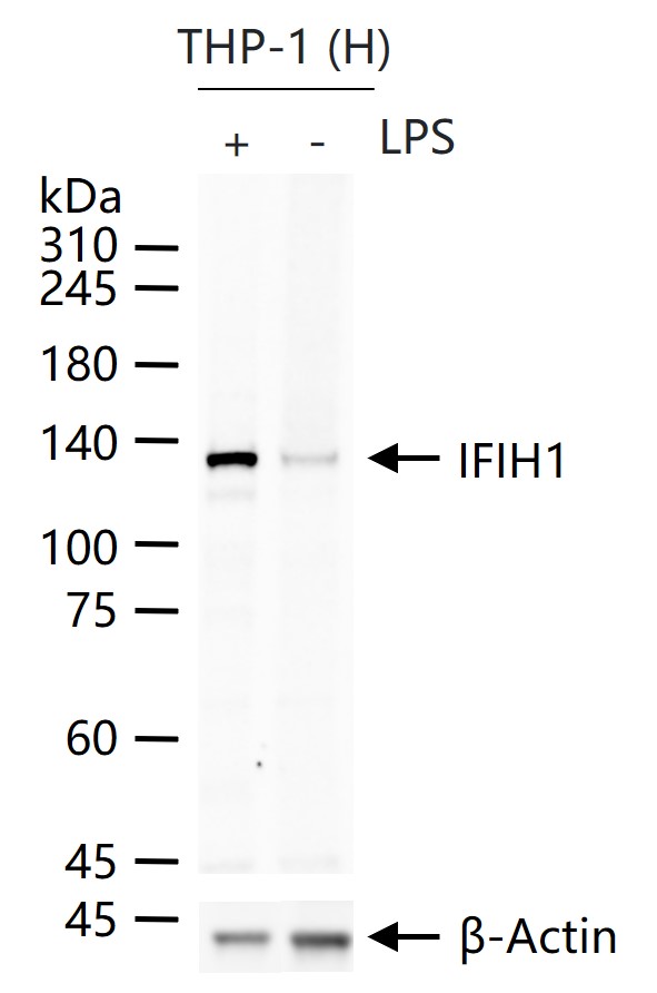 THP-1 (H) cells were treated with or without LPS (1 μg/ml) for 24 h, 25 μg total protein per lane of cell lysates (see on figure) probed with IFIH1 monoclonal antibody, unconjugated (bsm-61660R) at 1:1000 dilution and 4°C overnight incubation. Followed by conjugated secondary antibody incubation at r.t. for 60 min.