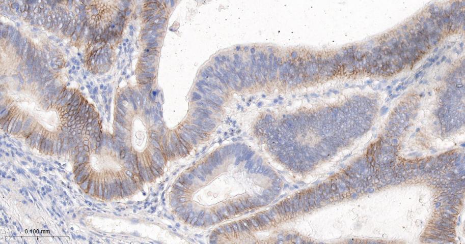 Paraformaldehyde-fixed, paraffin embedded Human Colon Cancer; Antigen retrieval by boiling in sodium citrate buffer (pH6.0) for 15 min; The section was incubated with CD166 Monoclonal Antibody, Unconjugated (bsm-61678R) at 1:200 overnight at 4°C, followed by conjugation to the bs-0295G-HRP and DAB (C-0010) staining.