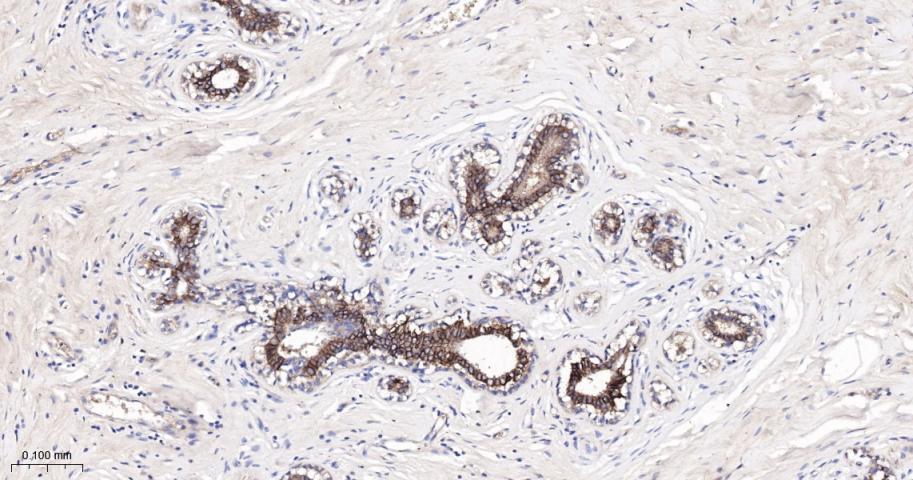 Paraformaldehyde-fixed, paraffin embedded Human Breast Cancer; Antigen retrieval by boiling in sodium citrate buffer (pH6.0) for 15 min; The section was incubated with CD166 Monoclonal Antibody, Unconjugated (bsm-61678R) at 1:200 overnight at 4°C, followed by conjugation to the bs-0295G-HRP and DAB (C-0010) staining.