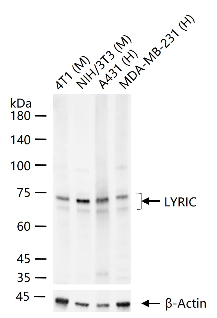 25 ug total protein per lane of various lysates (see on figure) probed with LYRIC monoclonal antibody, unconjugated (bsm-61692R) at 1:1000 dilution and 4°C overnight incubation. Followed by conjugated secondary antibody incubation at r.t. for 60 min.
