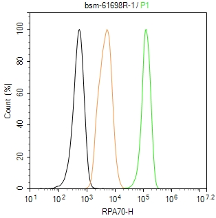 The Hela (H) cells were fixed with 4% PFA (10 min at r.t.) and then permeabilized with 90% ice-cold methanol for 20 min at -20℃,the cells then were incubated in 5%BSA to block non-specific protein-protein interactions (30 min at r.t.), followed by secondary antibody incubation for 40 min at room temperature. Primary Antibody (green):Rabbit Anti-RPA70 antibody (bsm-61698R,1:100); Isotype Control (orange): Rabbit IgG (bs-0295P). Blank control (black): PBS. Acquisition of 20,000 events was performed.