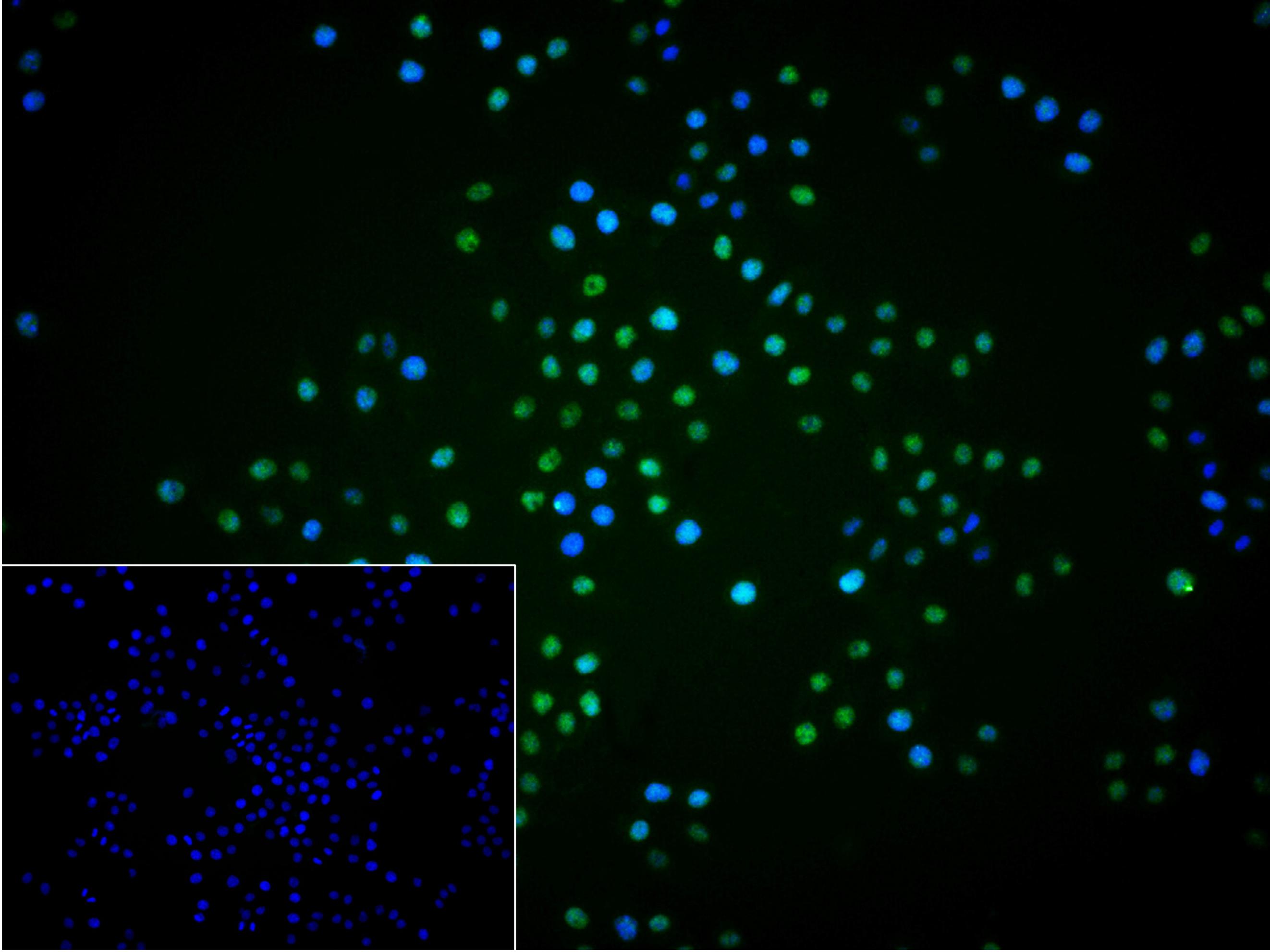 4% Paraformaldehyde-fixed Hela (H) cell; Triton X-100 at r.t. for 20 min; Antibody incubation with (RPA70) monoclonal Antibody, unconjugated (bsm-61698R) 1:100, 90 min at 37°C; followed by conjugated Goat Anti-Rabbit IgG antibody (green, bs-60295G-BF488) at 37°C for 90 min, DAPI (blue, C02-04002) was used to stain the cell nuclei. PBS instead of the primary antibody was used as the blank control.