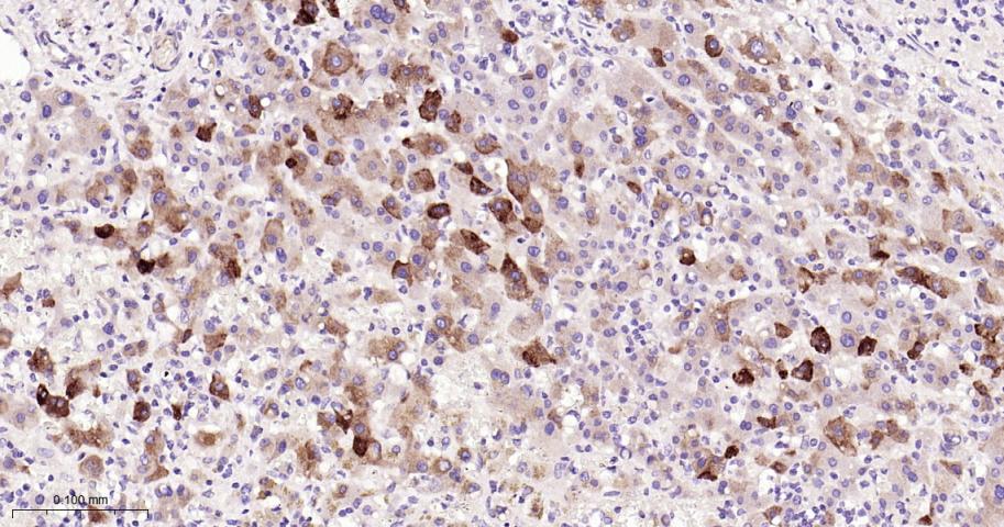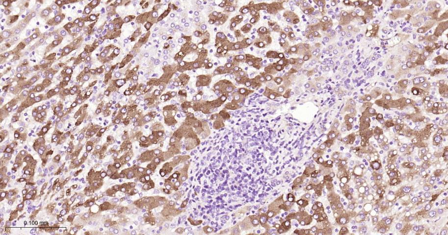 Paraformaldehyde-fixed, paraffin embedded Human Liver; Antigen retrieval by boiling in sodium citrate buffer (pH6.0) for 15 min; The section was incubated with CRP Monoclonal Antibody, Unconjugated (bsm-61699R) at 1:200 overnight at 4°C, followed by conjugation to the bs-0295G-HRP and DAB (C-0010) staining.
