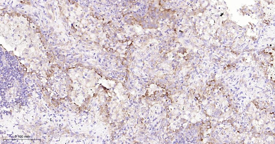 Paraformaldehyde-fixed, paraffin embedded Human Lung Cancer; Antigen retrieval by boiling in sodium citrate buffer (pH6.0) for 15 min; Antibody incubation with LRP/MVP Monoclonal Antibody, Unconjugated(bsm-61705R) at 1:200 overnight at 4°C, followed by conjugation to the bs-0295G-HRP and DAB (C-0010) staining.