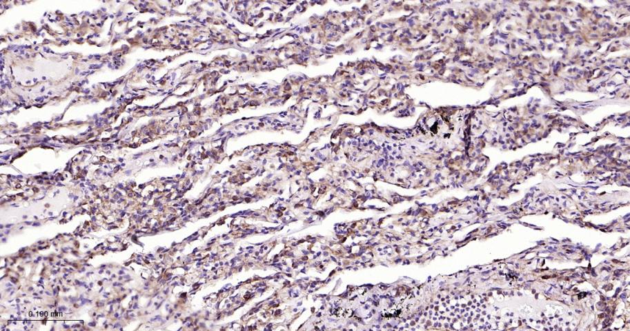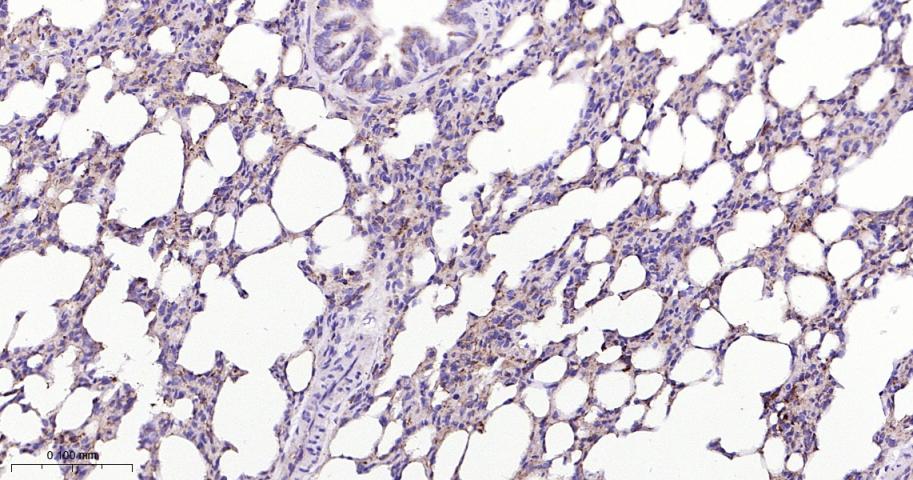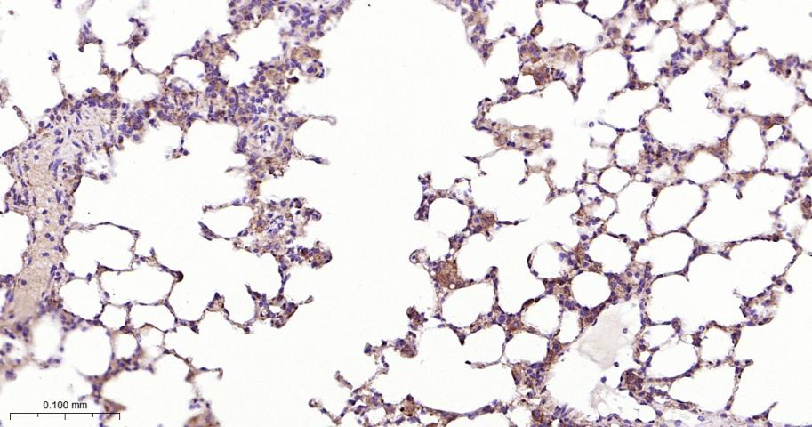 Paraformaldehyde-fixed, paraffin embedded Mouse Lung; Antigen retrieval by boiling in sodium citrate buffer (pH6.0) for 15 min; Antibody incubation with LRP/MVP Monoclonal Antibody, Unconjugated(bsm-61705R) at 1:200 overnight at 4°C, followed by conjugation to the bs-0295G-HRP and DAB (C-0010) staining.