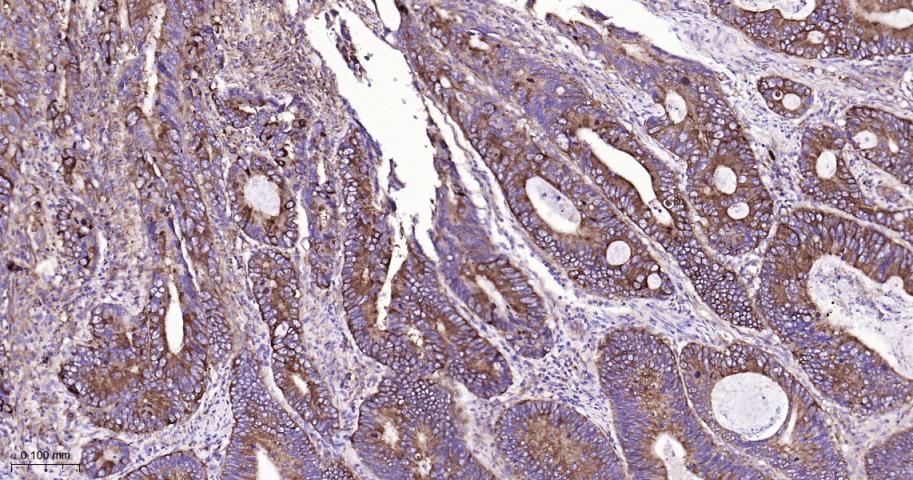 Paraformaldehyde-fixed, paraffin embedded Human Colon Cancer; Antigen retrieval by boiling in sodium citrate buffer (pH6.0) for 15 min; Antibody incubation with LRP/MVP Monoclonal Antibody, Unconjugated(bsm-61705R) at 1:200 overnight at 4°C, followed by conjugation to the bs-0295G-HRP and DAB (C-0010) staining.