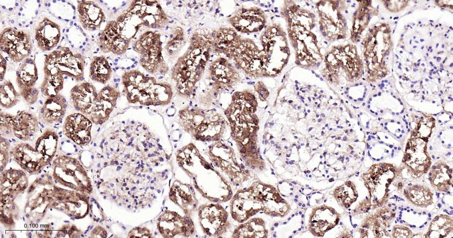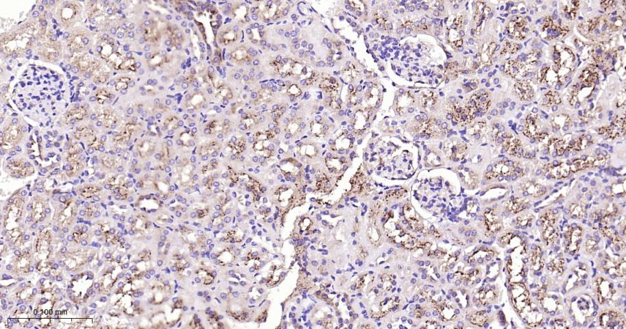 Paraformaldehyde-fixed, paraffin embedded Mouse Kidney; Antigen retrieval by boiling in sodium citrate buffer (pH6.0) for 15 min; Antibody incubation with LRP/MVP Monoclonal Antibody, Unconjugated(bsm-61705R) at 1:200 overnight at 4°C, followed by conjugation to the bs-0295G-HRP and DAB (C-0010) staining.