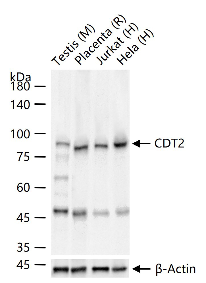 25 ug total protein per lane of various lysates (see on figure) probed with CDT2 monoclonal antibody, unconjugated (bsm-61709R) at 1:1000 dilution and 4°C overnight incubation. Followed by conjugated secondary antibody incubation at r.t. for 60 min.