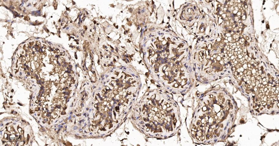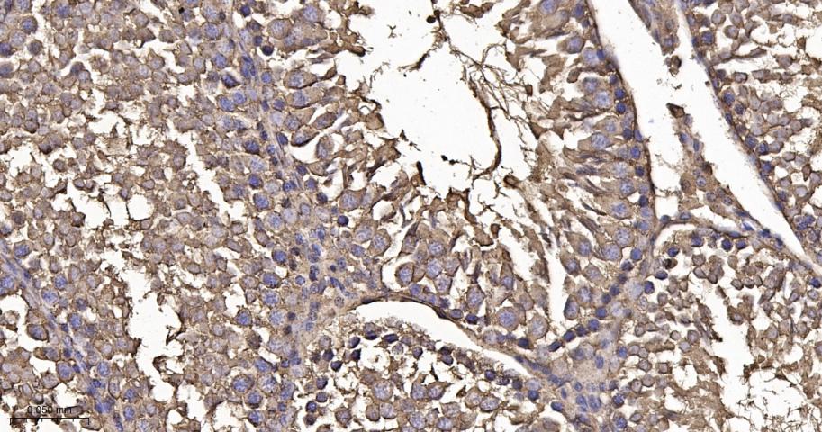 Paraformaldehyde-fixed, paraffin embedded Human Testicles; Antigen retrieval by boiling in sodium citrate buffer (pH6.0) for 15 min; The section was incubated with CDT2 Monoclonal Antibody, Unconjugated (bsm-61709R) at 1:200 overnight at 4°C, followed by conjugation to the bs-0295G-HRP and DAB (C-0010) staining.
