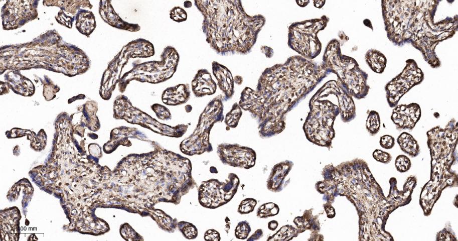 Paraformaldehyde-fixed, paraffin embedded Human Placenta; Antigen retrieval by boiling in sodium citrate buffer (pH6.0) for 15 min; The section was incubated with CDT2 Monoclonal Antibody, Unconjugated (bsm-61709R) at 1:200 overnight at 4°C, followed by conjugation to the bs-0295G-HRP and DAB (C-0010) staining.
