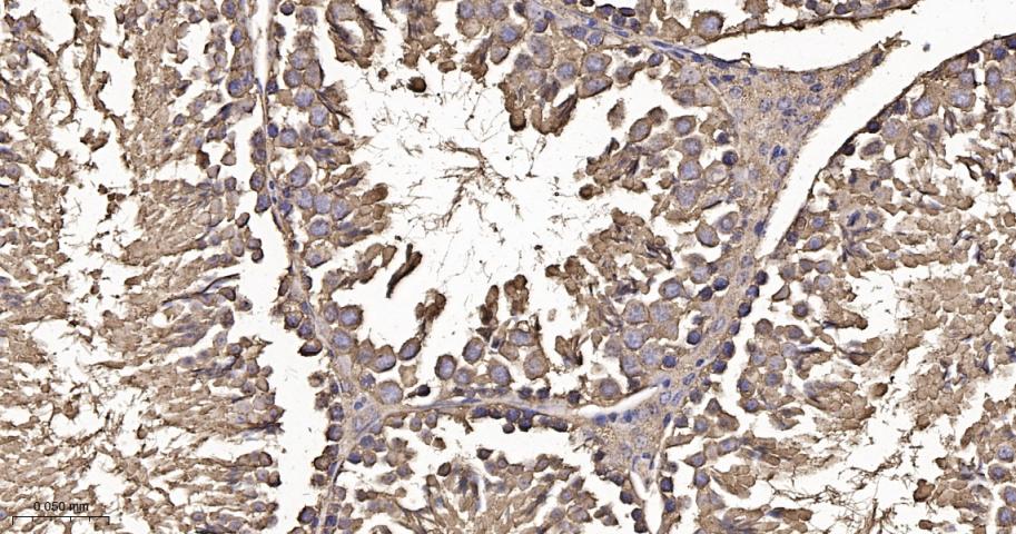 Paraformaldehyde-fixed, paraffin embedded Mouse Testicles; Antigen retrieval by boiling in sodium citrate buffer (pH6.0) for 15 min; The section was incubated with CDT2 Monoclonal Antibody, Unconjugated (bsm-61709R) at 1:200 overnight at 4°C, followed by conjugation to the bs-0295G-HRP and DAB (C-0010) staining.