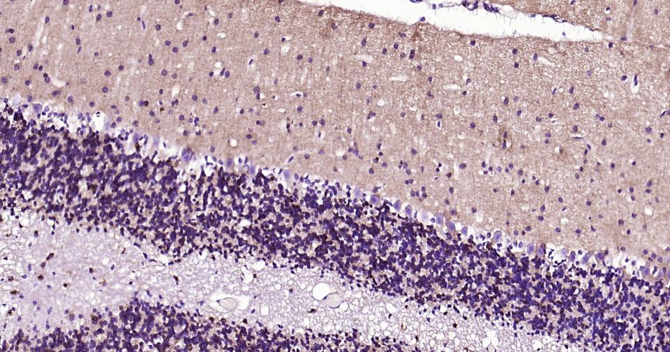 Paraformaldehyde-fixed, paraffin embedded Mouse Cerebellum; Antigen retrieval by boiling in sodium citrate buffer (pH6.0) for 15 min; Antibody incubation with beta I Tubulin Monoclonal Antibody, Unconjugated(bsm-61710R) at 1:200 overnight at 4°C, followed by conjugation to the bs-0295G-HRP and DAB (C-0010) staining.