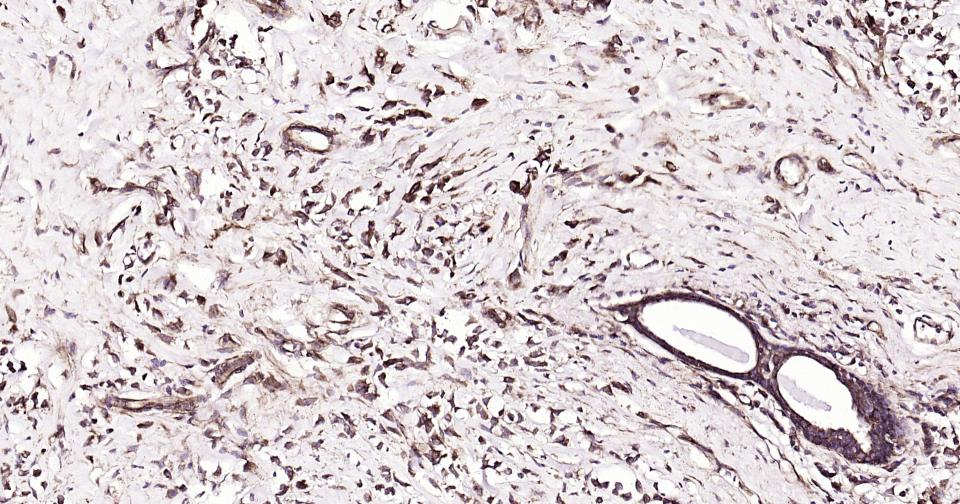 Paraformaldehyde-fixed, paraffin embedded Human Breast Cancer; Antigen retrieval by boiling in sodium citrate buffer (pH6.0) for 15 min; Antibody incubation with beta I Tubulin Monoclonal Antibody, Unconjugated(bsm-61710R) at 1:200 overnight at 4°C, followed by conjugation to the bs-0295G-HRP and DAB (C-0010) staining.