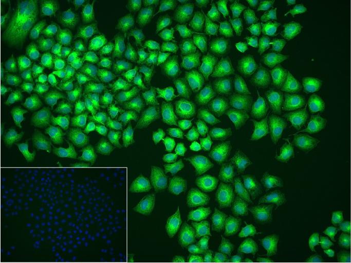 4% Paraformaldehyde-fixed Hela (H) cell; Triton X-100 at r.t. for 20 min; Antibody incubation with (beta I Tubulin) monoclonal Antibody, unconjugated (bsm-61710R) 1:100, 90 min at 37°C; followed by conjugated Goat Anti-Rabbit IgG antibody (green, bs-40295G-FITC) at 37°C for 90 min, DAPI (blue, C02-04002) was used to stain the cell nuclei. PBS instead of the primary antibody was used as the blank control.