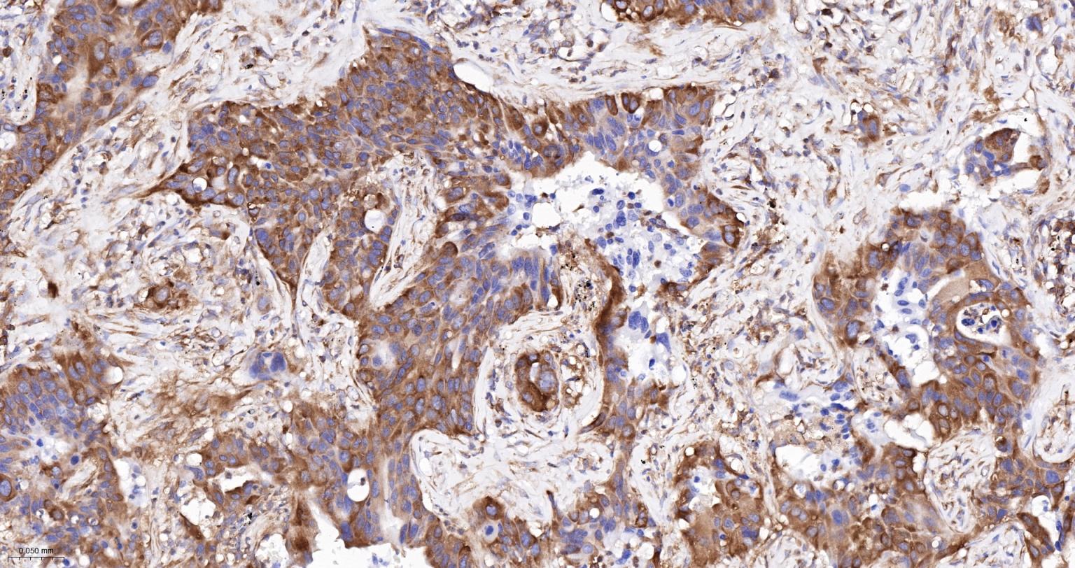 Paraformaldehyde-fixed, paraffin embedded Human Lung Cancer; Antigen retrieval by boiling in sodium citrate buffer (pH6.0) for 15 min; The section was incubated with phospho-EIF4B (Ser406) Monoclonal Antibody, Unconjugated (bsm-62634R) at 1:200 overnight at 4°C, followed by conjugation to the bs-0295G-HRP and DAB (C-0010) staining.
