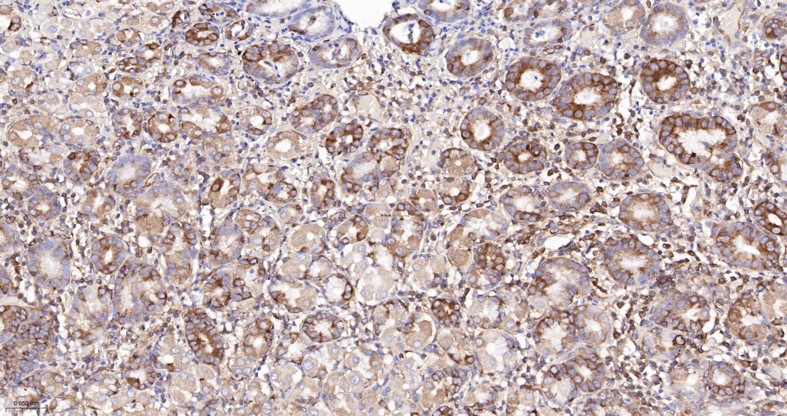 Paraformaldehyde-fixed, paraffin embedded Human Stomach; Antigen retrieval by boiling in sodium citrate buffer (pH6.0) for 15 min; The section was incubated with phospho-EIF4B (Ser406) Monoclonal Antibody, Unconjugated (bsm-62634R) at 1:200 overnight at 4°C, followed by conjugation to the bs-0295G-HRP and DAB (C-0010) staining.