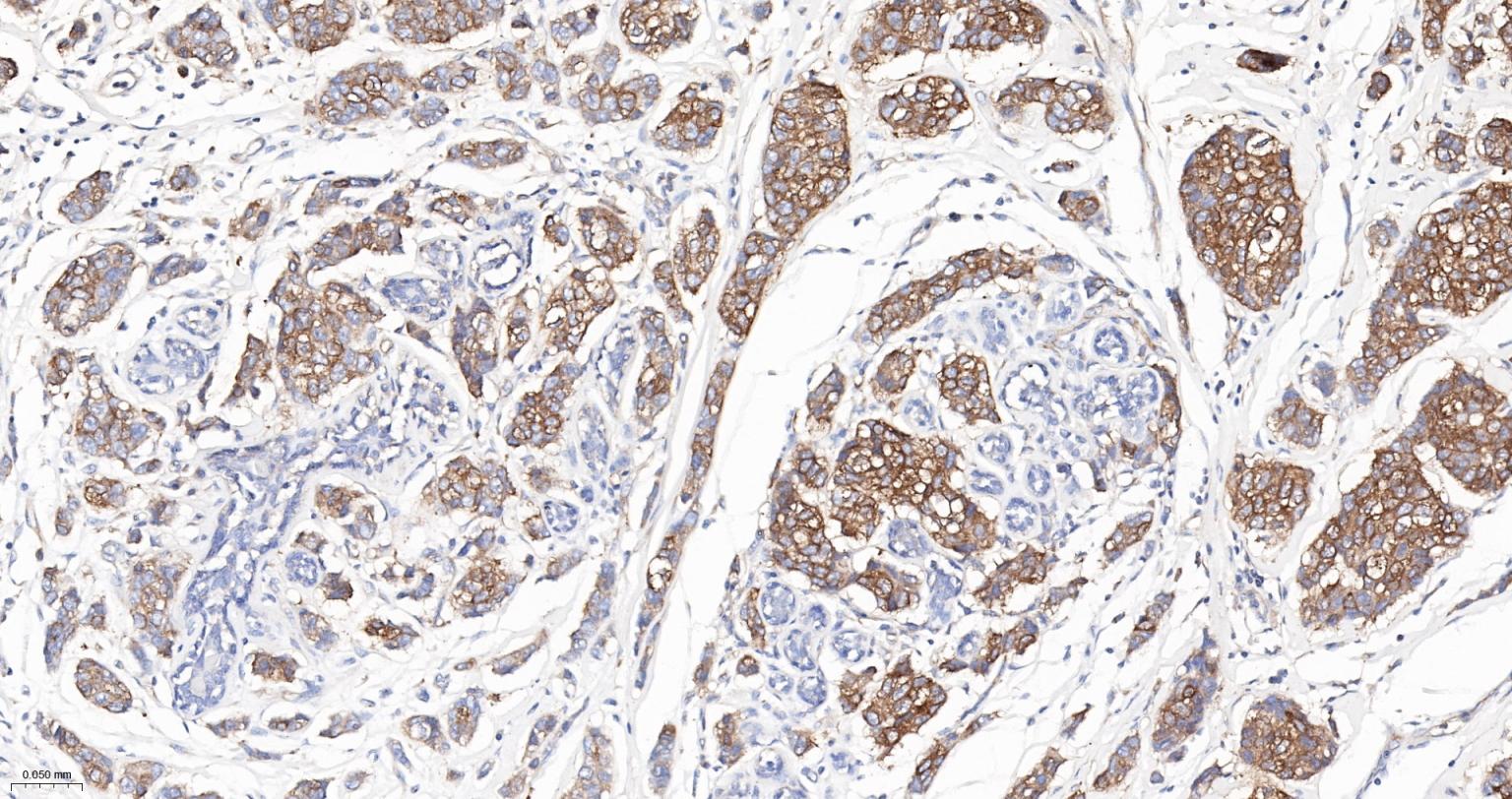 Paraformaldehyde-fixed, paraffin embedded Human Breast Cancer; Antigen retrieval by boiling in sodium citrate buffer (pH6.0) for 15 min; The section was incubated with phospho-EIF4B (Ser406) Monoclonal Antibody, Unconjugated (bsm-62634R) at 1:200 overnight at 4°C, followed by conjugation to the bs-0295G-HRP and DAB (C-0010) staining.