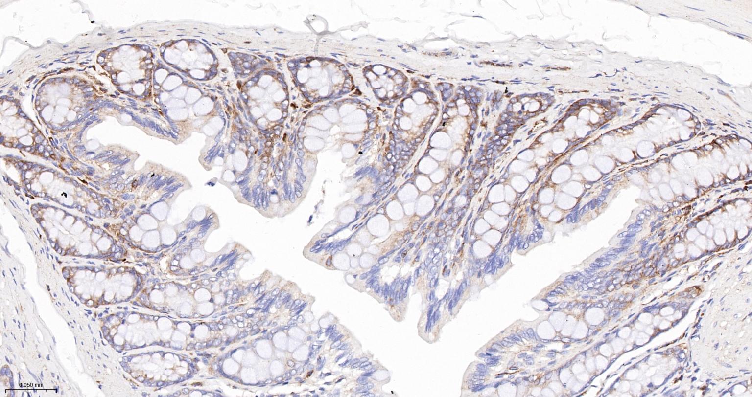 Paraformaldehyde-fixed, paraffin embedded Mouse Colon; Antigen retrieval by boiling in sodium citrate buffer (pH6.0) for 15 min; The section was incubated with phospho-EIF4B (Ser406) Monoclonal Antibody, Unconjugated (bsm-62634R) at 1:200 overnight at 4°C, followed by conjugation to the bs-0295G-HRP and DAB (C-0010) staining.