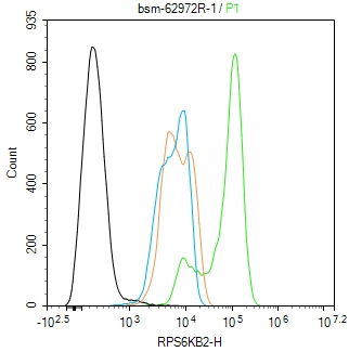 The MCF-7 (H) cells were fixed with 4% PFA (10 min at r.t.) and then permeabilized with 90% ice-cold methanol for 20 min at -20℃,the cells then were incubated in 5%BSA to block non-specific protein-protein interactions (30 min at r.t.).Primary Antibody (green):Rabbit Anti-RPS6KB2 antibody (bsm-62972R): 1 μg/10^6 cells; Secondary Antibody (white blue): Goat anti-Rabbit IgG-FITC (bs-40295G-FITC): 1 μg/test. Isotype Control (orange): Rabbit IgG (bs-0295P). Blank control (black): PBS. Acquisition of 20,000 events was performed.