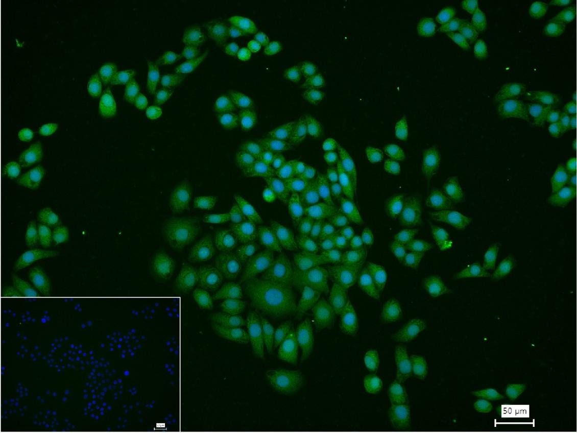 4% Paraformaldehyde-fixed MCF-7 (H) cell; Triton X-100 at r.t. for 20 min; Antibody incubation with (RPS6KB2) monoclonal Antibody, unconjugated (bsm-62972R) 1:100, 90 min at 37°C; followed by conjugated Goat Anti-Rabbit IgG antibody (green, bs-40295G-FITC) at 37°C for 90 min, DAPI (blue, C02-04002) was used to stain the cell nuclei. PBS instead of the primary antibody was used as the blank control.
