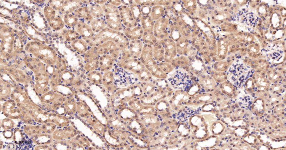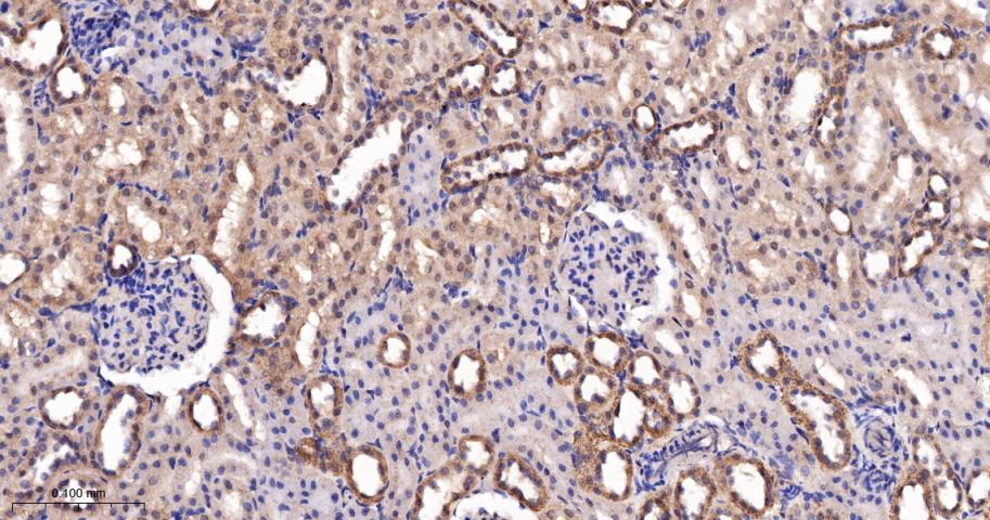 Paraformaldehyde-fixed, paraffin embedded Mouse Kidney; Antigen retrieval by boiling in sodium citrate buffer (pH6.0) for 15 min; The section was incubated with RPS6KB2 Monoclonal Antibody, Unconjugated (bsm-62972R) at 1:200 overnight at 4°C, followed by conjugation to the bs-0295G-HRP and DAB (C-0010) staining.