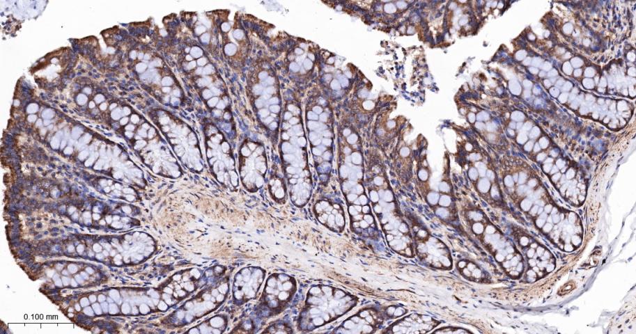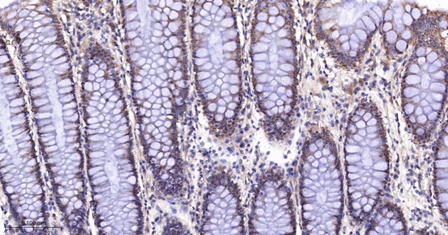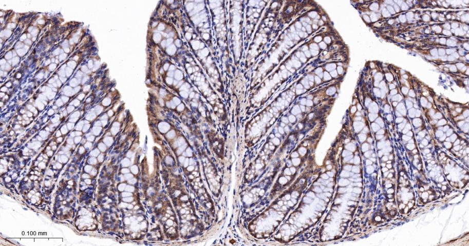 Paraformaldehyde-fixed, paraffin embedded Mouse Colon; Antigen retrieval by boiling in sodium citrate buffer (pH6.0) for 15 min; The section was incubated with RPS6KB2 Monoclonal Antibody, Unconjugated (bsm-62972R) at 1:200 overnight at 4°C, followed by conjugation to the bs-0295G-HRP and DAB (C-0010) staining.