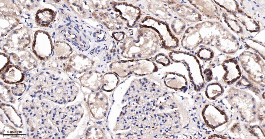 Paraformaldehyde-fixed, paraffin embedded Human Kidney; Antigen retrieval by boiling in sodium citrate buffer (pH6.0) for 15 min; The section was incubated with RPS6KB2 Monoclonal Antibody, Unconjugated (bsm-62972R) at 1:200 overnight at 4°C, followed by conjugation to the bs-0295G-HRP and DAB (C-0010) staining.