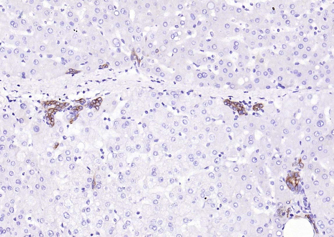 Paraformaldehyde-fixed, paraffin embedded (human liver); Antigen retrieval by boiling in sodium citrate buffer (pH6.0) for 15min; Block endogenous peroxidase by 3% hydrogen peroxide for 20 minutes; Blocking buffer (normal goat serum) at 37°C for 30min; Antibody incubation with (Cytokeratin 8) Polyclonal Antibody, Unconjugated (bs-1106R) at 1:200 overnight at 4°C, followed by operating according to SP Kit(Rabbit) (sp-0023) instructionsand DAB staining.