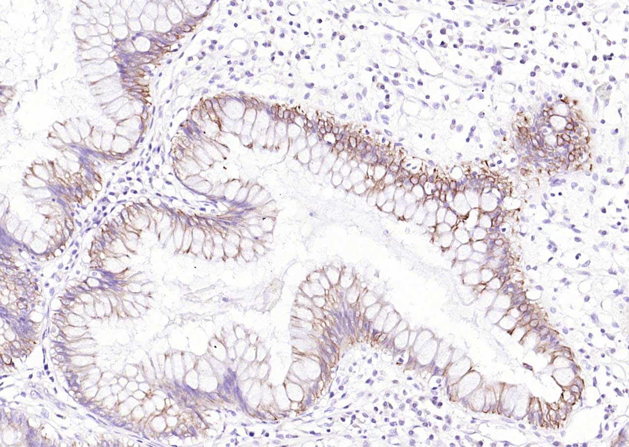 Paraformaldehyde-fixed, paraffin embedded (human colon); Antigen retrieval by boiling in sodium citrate buffer (pH6.0) for 15min; Block endogenous peroxidase by 3% hydrogen peroxide for 20 minutes; Blocking buffer (normal goat serum) at 37°C for 30min; Antibody incubation with (Cytokeratin 8) Polyclonal Antibody, Unconjugated (bs-1106R) at 1:200 overnight at 4°C, followed by operating according to SP Kit(Rabbit) (sp-0023) instructionsand DAB staining.