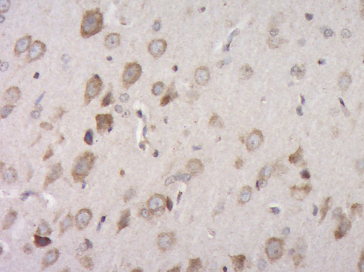 Paraformaldehyde-fixed, paraffin embedded (Rat brain); Antigen retrieval by boiling in sodium citrate buffer (pH6.0) for 15min; Block endogenous peroxidase by 3% hydrogen peroxide for 20 minutes; Blocking buffer (normal goat serum) at 37°C for 30min; Antibody incubation with (CCL4) Polyclonal Antibody, Unconjugated (bs-1046R) at 1:400 overnight at 4°C, followed by operating according to SP Kit(Rabbit) (sp-0023) instructions and DAB staining.