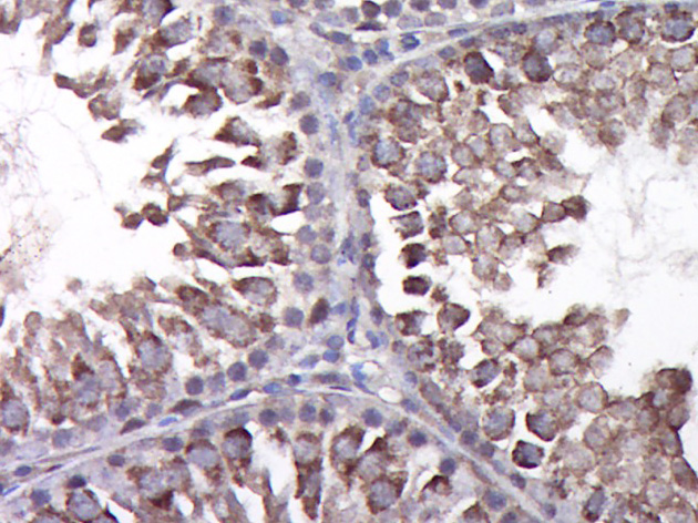 Paraformaldehyde-fixed, paraffin embedded (Rat testis); Antigen retrieval by boiling in sodium citrate buffer (pH6.0) for 15min; Block endogenous peroxidase by 3% hydrogen peroxide for 20 minutes; Blocking buffer (normal goat serum) at 37°C for 30min; Antibody incubation with (CCL4) Polyclonal Antibody, Unconjugated (bs-1046R) at 1:400 overnight at 4°C, followed by operating according to SP Kit(Rabbit) (sp-0023) instructions and DAB staining.