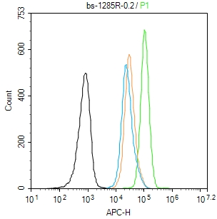 Blank control: A431. Primary Antibody (green line): Rabbit Anti-ETS1 antibody (bs-1285R) Dilution: 0.2μg /10^6 cells; Isotype Control Antibody (orange line): Rabbit IgG . Secondary Antibody : Goat anti-rabbit IgG-AF647 Dilution: 1μg /test. Protocol The cells were fixed with 4% PFA (10min at room temperature)and then permeabilized with 90% ice-cold methanol for 20 min at-20℃. The cells were then incubated in 5%BSA to block non-specific protein-protein interactions for 30 min at at room temperature .Cells stained with Primary Antibody for 30 min at room temperature. The secondary antibody used for 40 min at room temperature. Acquisition of 20,000 events was performed.