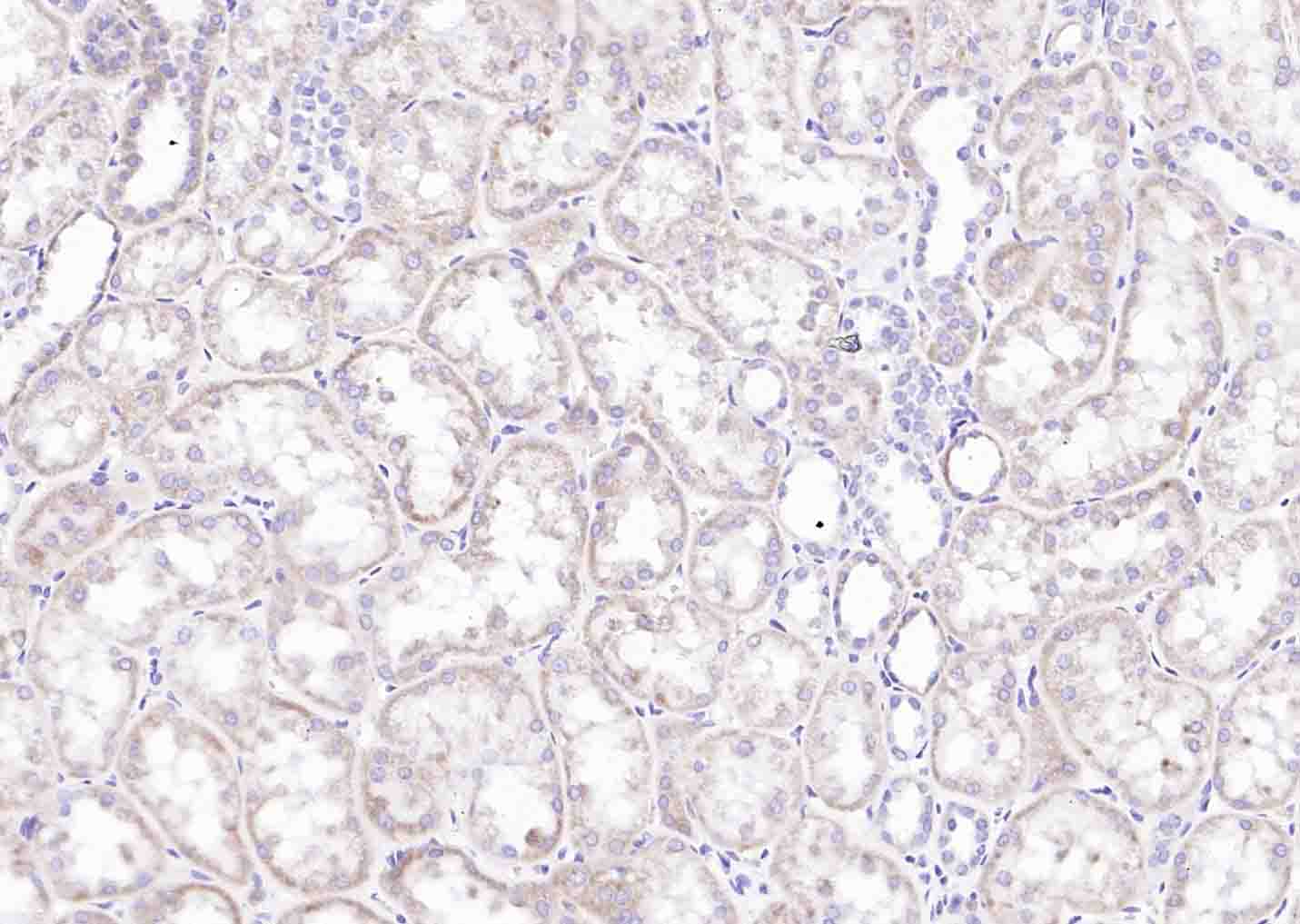 Paraformaldehyde-fixed, paraffin embedded (Human kidney); Antigen retrieval by boiling in sodium citrate buffer (pH6.0) for 15min; Block endogenous peroxidase by 3% hydrogen peroxide for 20 minutes; Blocking buffer (normal goat serum) at 37°C for 30min; Antibody incubation with (CCN1) Polyclonal Antibody, Unconjugated (bs-1290R) at 1:200 overnight at 4°C, followed by operating according to SP Kit(Rabbit) (sp-0023) instructionsand DAB staining.