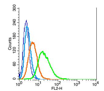 The cells were fixed with 2% paraformaldehyde (10 min). Primary antibody (bs-1292R, 1μg /1x10^6 cells) were incubated for 30 min on the ice, followed by 1 X PBS containing 0.5% BSA + 1 0% goat serum (15 min) to block non-specific protein-protein interactions. Then the Goat Anti-rabbit IgG/PE antibody was added into the blocking buffer mentioned above to react with the primary antibody at 1/200 dilution for 30 min on ice. Acquisition of 20,000 events was performed.
