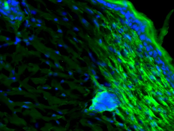 C57BL/6 mice skin were fixed in pre-chilled MeOH and incubated at -20℃ for 10 minutes. They were washed in PBS at RT 3 times for 5 minutes each. The sections were blocked for 60 minutes at RT with PBS containing 5% BSA. The block was removed, anti-CXCL10 antibody (bs-1502R) diluted 1:50 was added, then incubated overnight at 4℃.Then washed with PBS (0.005% Tween20) for 15 minutes each followed by 2 washes of PBS for 5 minutes each. The secondary antibody, anti-rabbit A488 was diluted 1:500, added to the sections and incubated for 1 hour at RT. Then washed for 10 minutes in PBS 4 times
