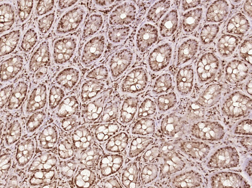 Paraformaldehyde-fixed, paraffin embedded (Mouse colon); Antigen retrieval by boiling in sodium citrate buffer (pH6.0) for 15min; Block endogenous peroxidase by 3% hydrogen peroxide for 20 minutes; Blocking buffer (normal goat serum) at 37°C for 30min; Antibody incubation with (eIF4G) Polyclonal Antibody, Unconjugated (bs-3843R) at 1:400 overnight at 4°C, followed by operating according to SP Kit(Rabbit) (sp-0023) instructionsand DAB staining.