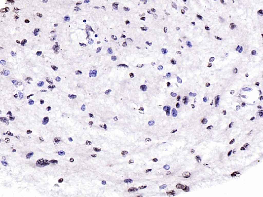 Paraformaldehyde-fixed, paraffin embedded (human brain); Antigen retrieval by boiling in sodium citrate buffer (pH6.0) for 15min; Block endogenous peroxidase by 3% hydrogen peroxide for 20 minutes; Blocking buffer (normal goat serum) at 37°C for 30min; Antibody incubation with (eIF4G) Polyclonal Antibody, Unconjugated (bs-3843R) at 1:200 overnight at 4°C, followed by operating according to SP Kit(Rabbit) (sp-0023) instructionsand DAB staining.