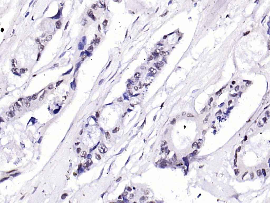 Paraformaldehyde-fixed, paraffin embedded (human breast carcinoma); Antigen retrieval by boiling in sodium citrate buffer (pH6.0) for 15min; Block endogenous peroxidase by 3% hydrogen peroxide for 20 minutes; Blocking buffer (normal goat serum) at 37°C for 30min; Antibody incubation with (eIF4G) Polyclonal Antibody, Unconjugated (bs-3843R) at 1:200 overnight at 4°C, followed by operating according to SP Kit(Rabbit) (sp-0023) instructionsand DAB staining.