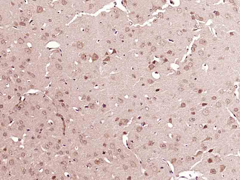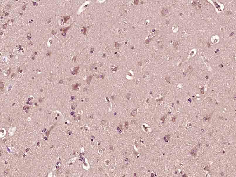 Paraformaldehyde-fixed, paraffin embedded (Mouse brain); Antigen retrieval by boiling in sodium citrate buffer (pH6.0) for 15min; Block endogenous peroxidase by 3% hydrogen peroxide for 20 minutes; Blocking buffer (normal goat serum) at 37°C for 30min; Antibody incubation with (ATG4A) Polyclonal Antibody, Unconjugated (bs-3873R) at 1:400 overnight at 4°C, followed by operating according to SP Kit(Rabbit) (sp-0023) instructionsand DAB staining.