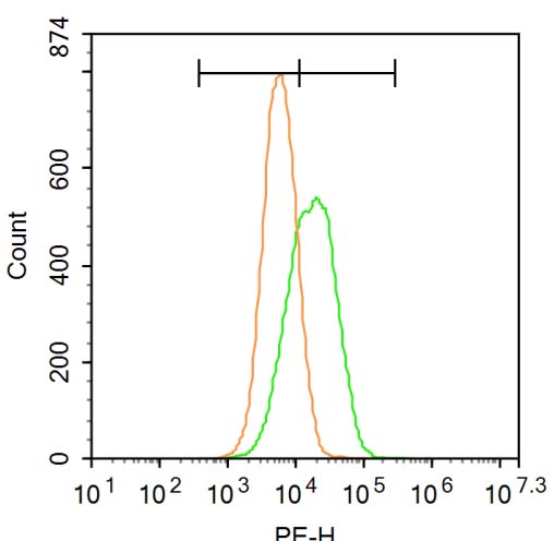 Blank control: U87MG. Primary Antibody (green line): Rabbit Anti-ADAM23 antibody (bs-5853R) Dilution: 1μg /10^6 cells; Isotype Control Antibody (orange line): Rabbit IgG . Secondary Antibody : Goat anti-rabbit IgG-PE Dilution: 1μg /test. The cells were incubated in 5%BSA to block non-specific protein-protein interactions for 30 min at at room temperature .Cells stained with Primary Antibody for 30 min at room temperature. The secondary antibody used for 40 min at room temperature. Acquisition of 20,000 events was performed.