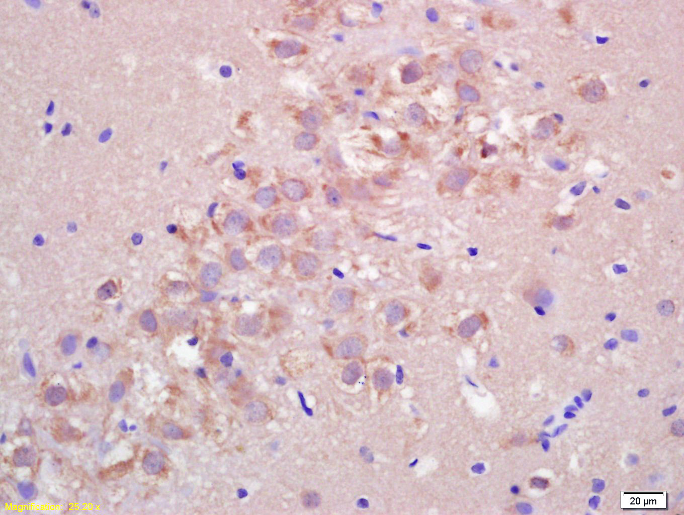 Paraformaldehyde-fixed, paraffin embedded (rat brain tissue); Antigen retrieval by boiling in sodium citrate buffer (pH6.0) for 15min; Block endogenous peroxidase by 3% hydrogen peroxide for 20 minutes; Blocking buffer (normal goat serum) at 37°C for 30min; Antibody incubation with (FIS1) Polyclonal Antibody, Unconjugated (bs-7646R) at 1:200 overnight at 4°C, followed by operating according to SP Kit(Rabbit) (sp-0023) instructionsand DAB staining.