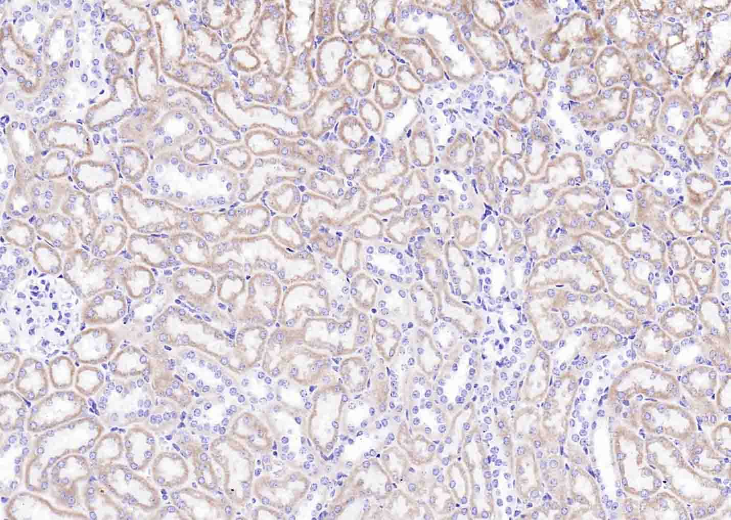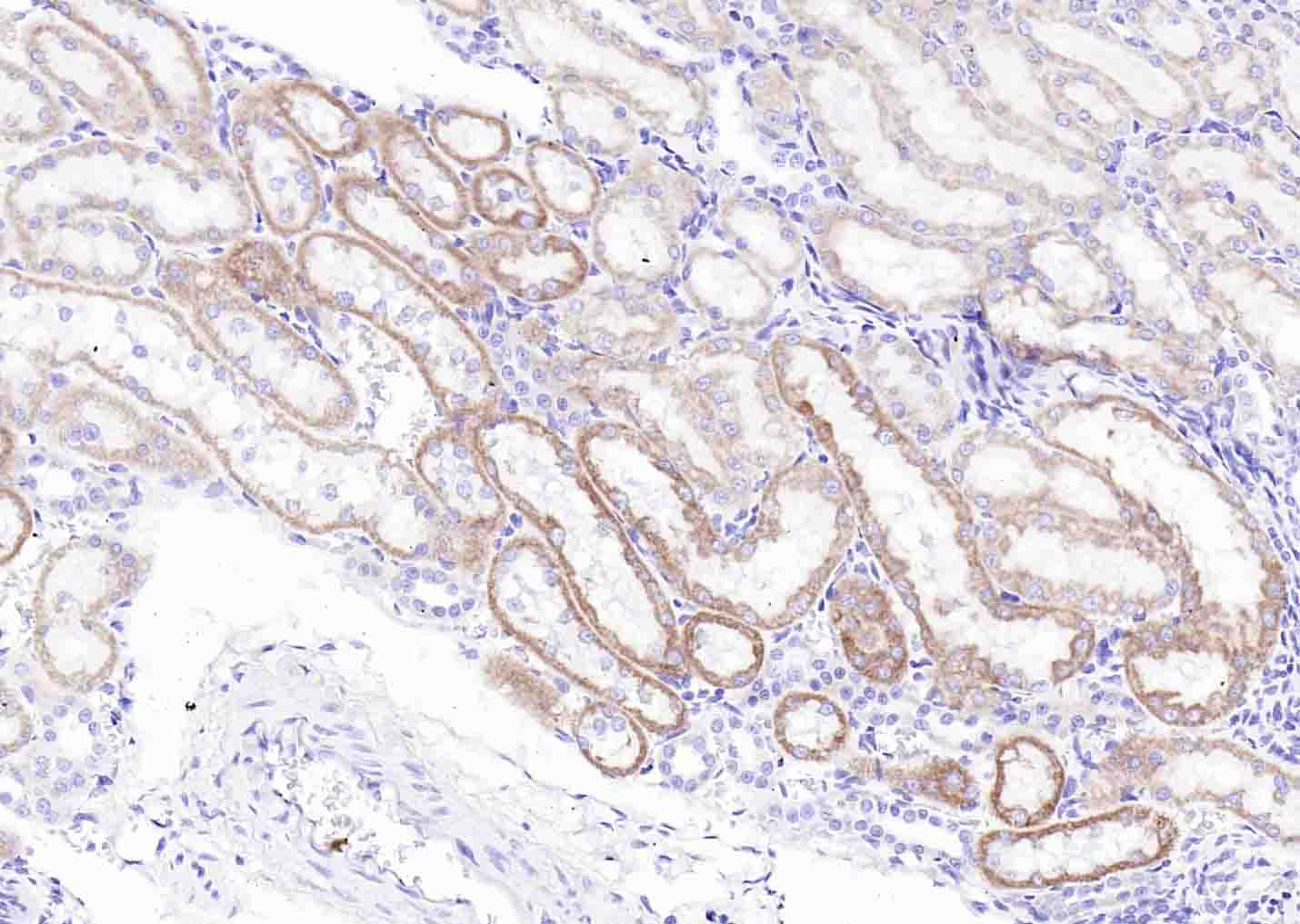 Paraformaldehyde-fixed, paraffin embedded (mouse kidney); Antigen retrieval by boiling in sodium citrate buffer (pH6.0) for 15min; Block endogenous peroxidase by 3% hydrogen peroxide for 20 minutes; Blocking buffer (normal goat serum) at 37°C for 30min; Antibody incubation with (PRDX2) Polyclonal Antibody, Unconjugated (bs-8300R) at 1:200 overnight at 4°C, followed by operating according to SP Kit(Rabbit) (sp-0023) instructionsand DAB staining.