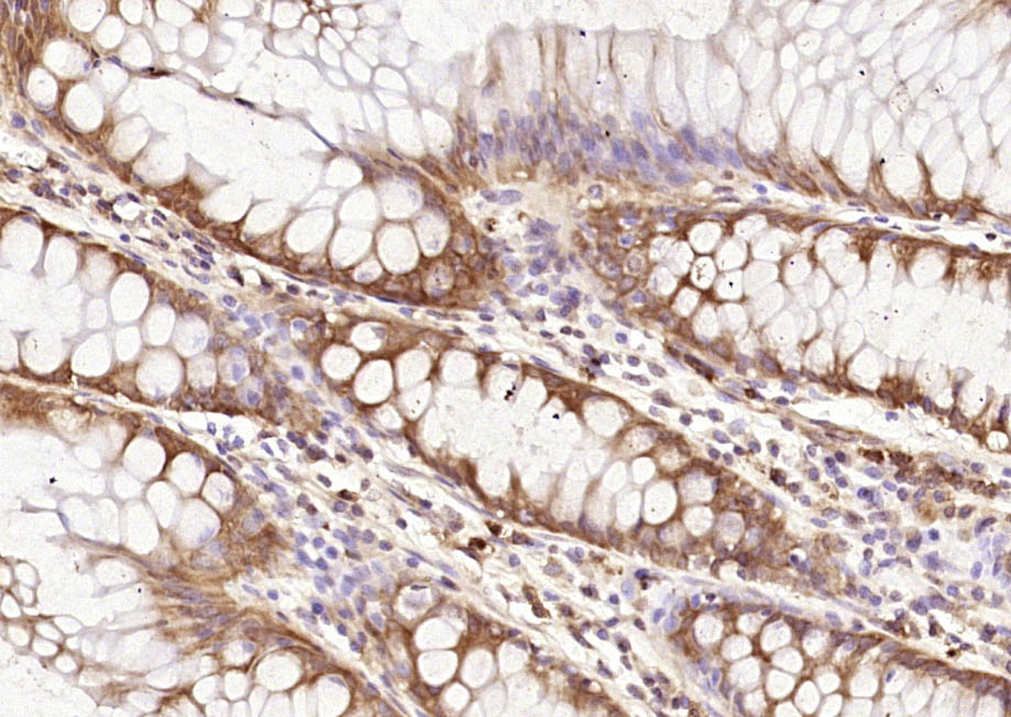 Paraformaldehyde-fixed, paraffin embedded (human colon carcinoma); Antigen retrieval by boiling in sodium citrate buffer (pH6.0) for 15min; Block endogenous peroxidase by 3% hydrogen peroxide for 20 minutes; Blocking buffer (normal goat serum) at 37°C for 30min; Antibody incubation with (Peroxiredoxin 2) Polyclonal Antibody, Unconjugated (bs-8300R) at 1:200 overnight at 4°C, followed by operating according to SP Kit(Rabbit) (sp-0023) instructionsand DAB staining.