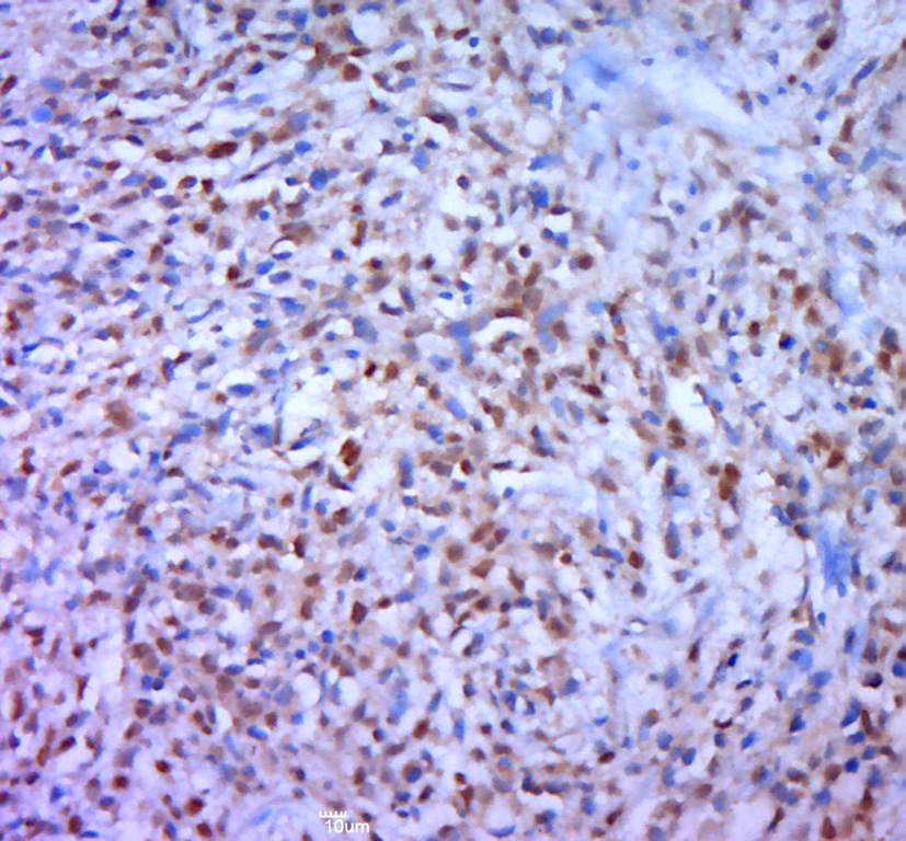 Paraformaldehyde-fixed, paraffin embedded (human gastric carcinoma); Antigen retrieval by boiling in sodium citrate buffer (pH6.0) for 15min; Block endogenous peroxidase by 3% hydrogen peroxide for 20 minutes; Blocking buffer (normal goat serum) at 37°C for 30min; Antibody incubation with (p-DAXX (Ser668)) Polyclonal Antibody, Unconjugated (bs-12984R) at 1:400 overnight at 4°C, followed by a conjugated secondary (sp-0023) for 20 minutes and DAB staining.