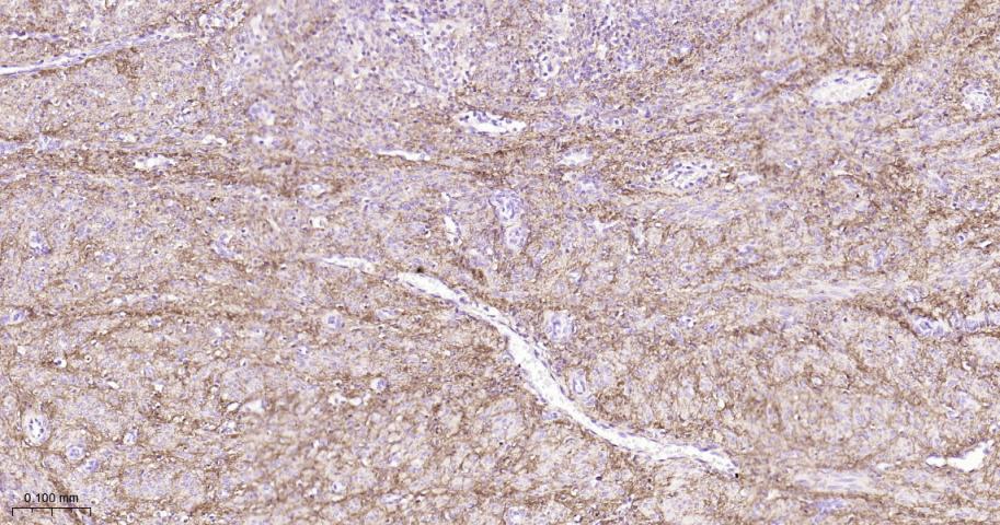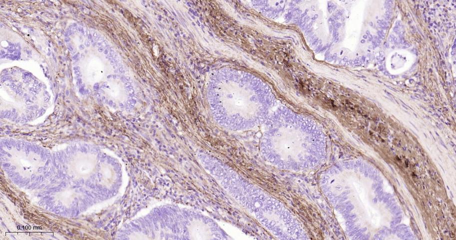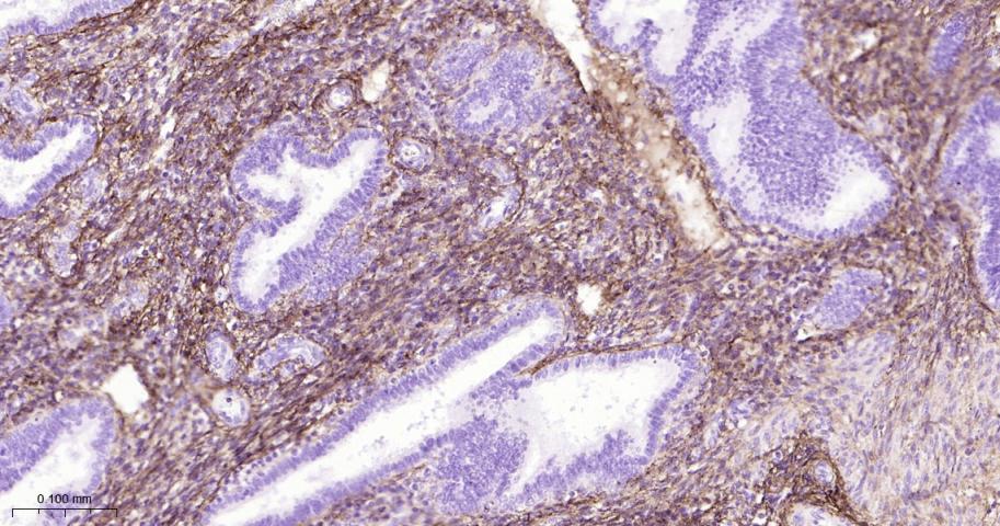 Paraformaldehyde-fixed, paraffin embedded Human Endometrial Cancer; Antigen retrieval by boiling in sodium citrate buffer (pH6.0) for 15 min; The section was incubated with Collagen I Polyclonal Antibody, Unconjugated (bs-10423R) at 1:800 overnight at 4°C, followed by conjugation to the bs-0295G-HRP and DAB (C-0010) staining.