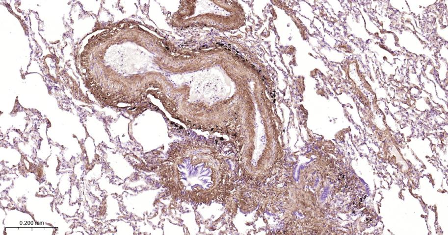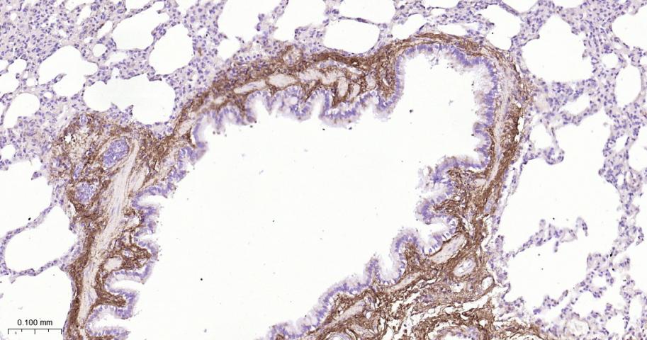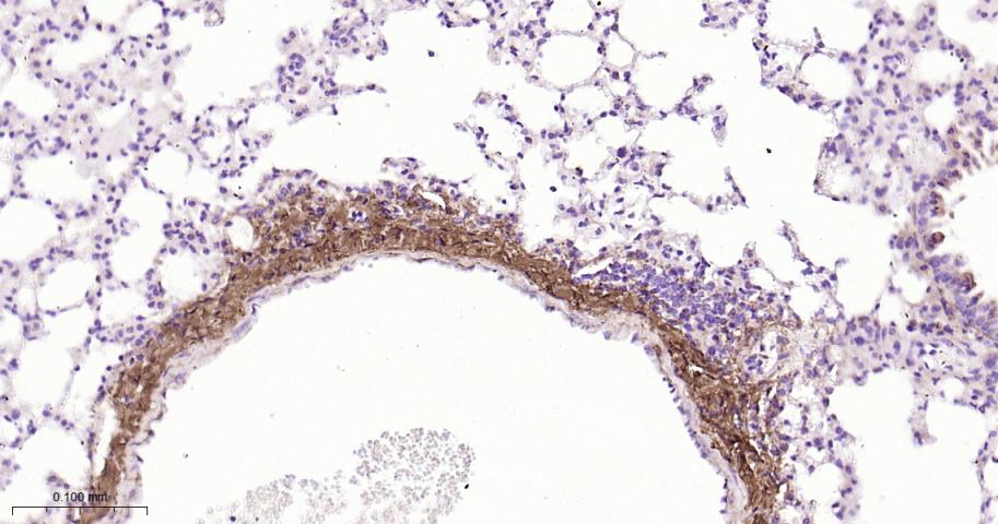 Paraformaldehyde-fixed, paraffin embedded Mouse Lung; Antigen retrieval by boiling in sodium citrate buffer (pH6.0) for 15 min; The section was incubated with Collagen I Polyclonal Antibody, Unconjugated (bs-10423R) at 1:800 overnight at 4°C, followed by conjugation to the bs-0295G-HRP and DAB (C-0010) staining.