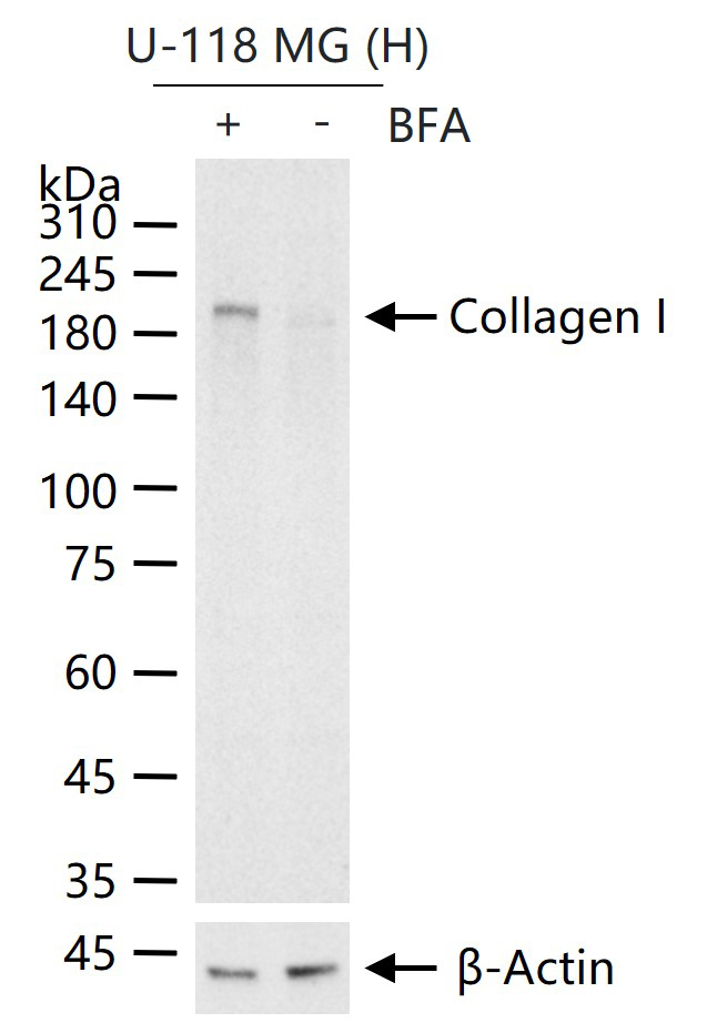 U-118 MG (H) cells were treated with or without BFA, 25 μg total protein per lane of cell lysates (see on figure) probed with Collagen I polyclonal antibody, unconjugated (bs-10423R) at 1:1000 dilution and 4°C overnight incubation. Followed by conjugated secondary antibody incubation at r.t. for 60 min.