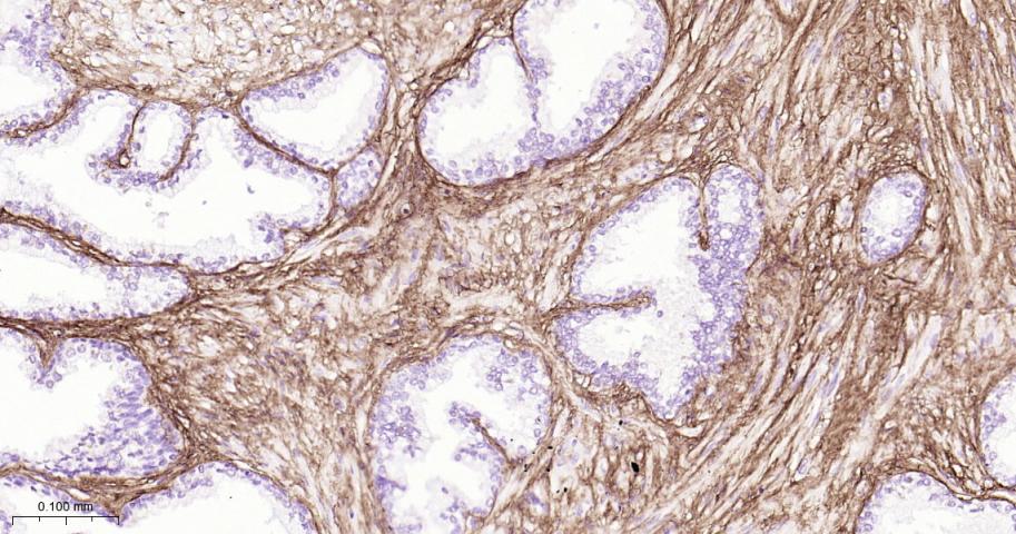Paraformaldehyde-fixed, paraffin embedded Human Prostate Cancer; Antigen retrieval by boiling in sodium citrate buffer (pH6.0) for 15 min; The section was incubated with Collagen I Polyclonal Antibody, Unconjugated (bs-10423R) at 1:800 overnight at 4°C, followed by conjugation to the bs-0295G-HRP and DAB (C-0010) staining.